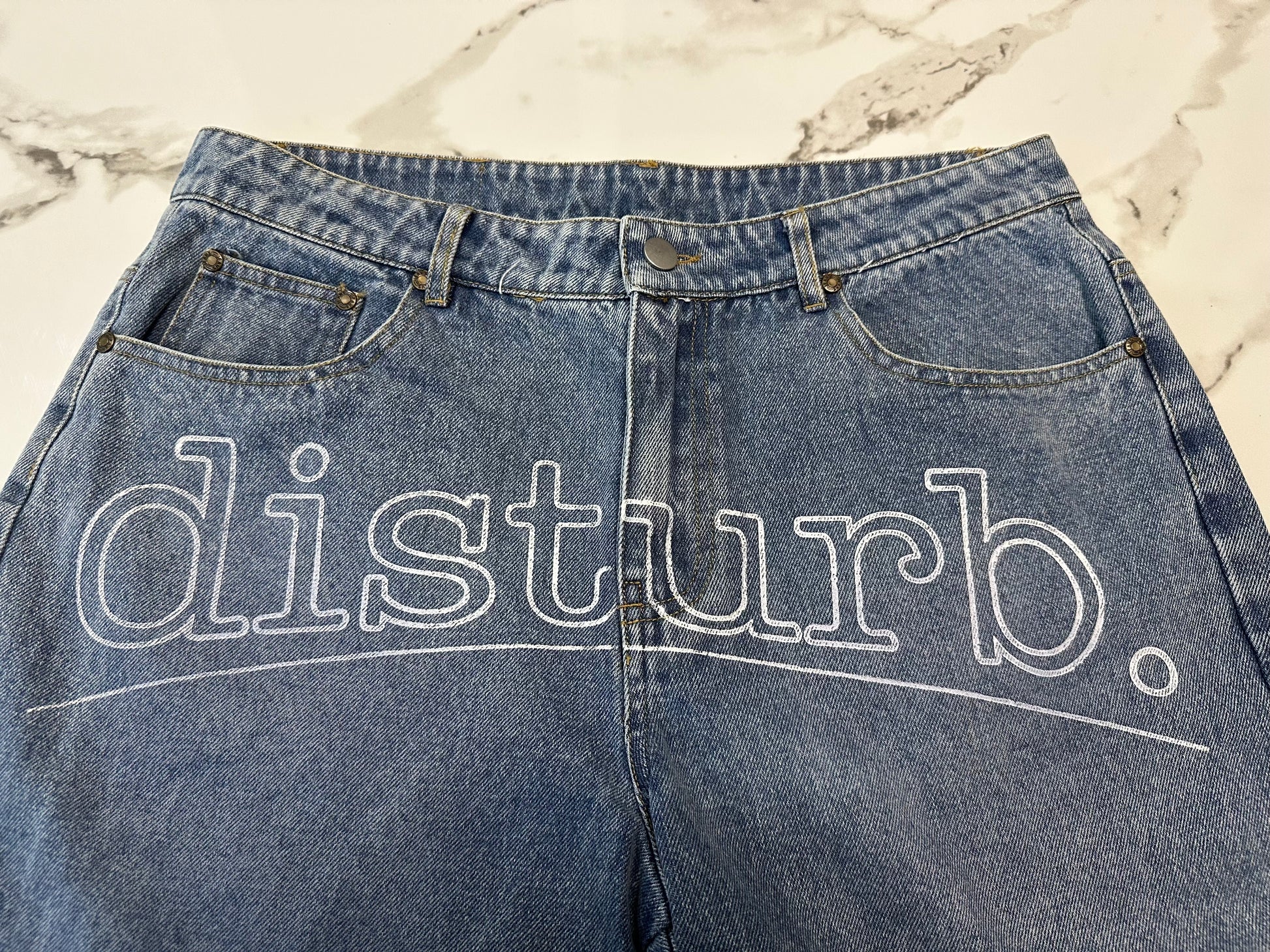 Denim jorts “disturb” front logo